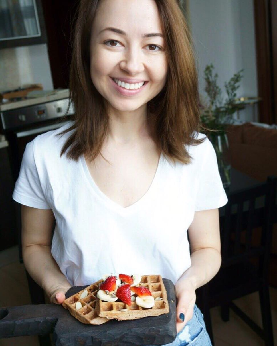 Вафли я готовлю из спельтовой (полбяной) муки, дрожжей и банана, а вместо сахара добавляет мёд. Хотите подсластить посильнее - украсьте свежей клубникой, апельсином или черникой и посыпьте лепестками миндаля.